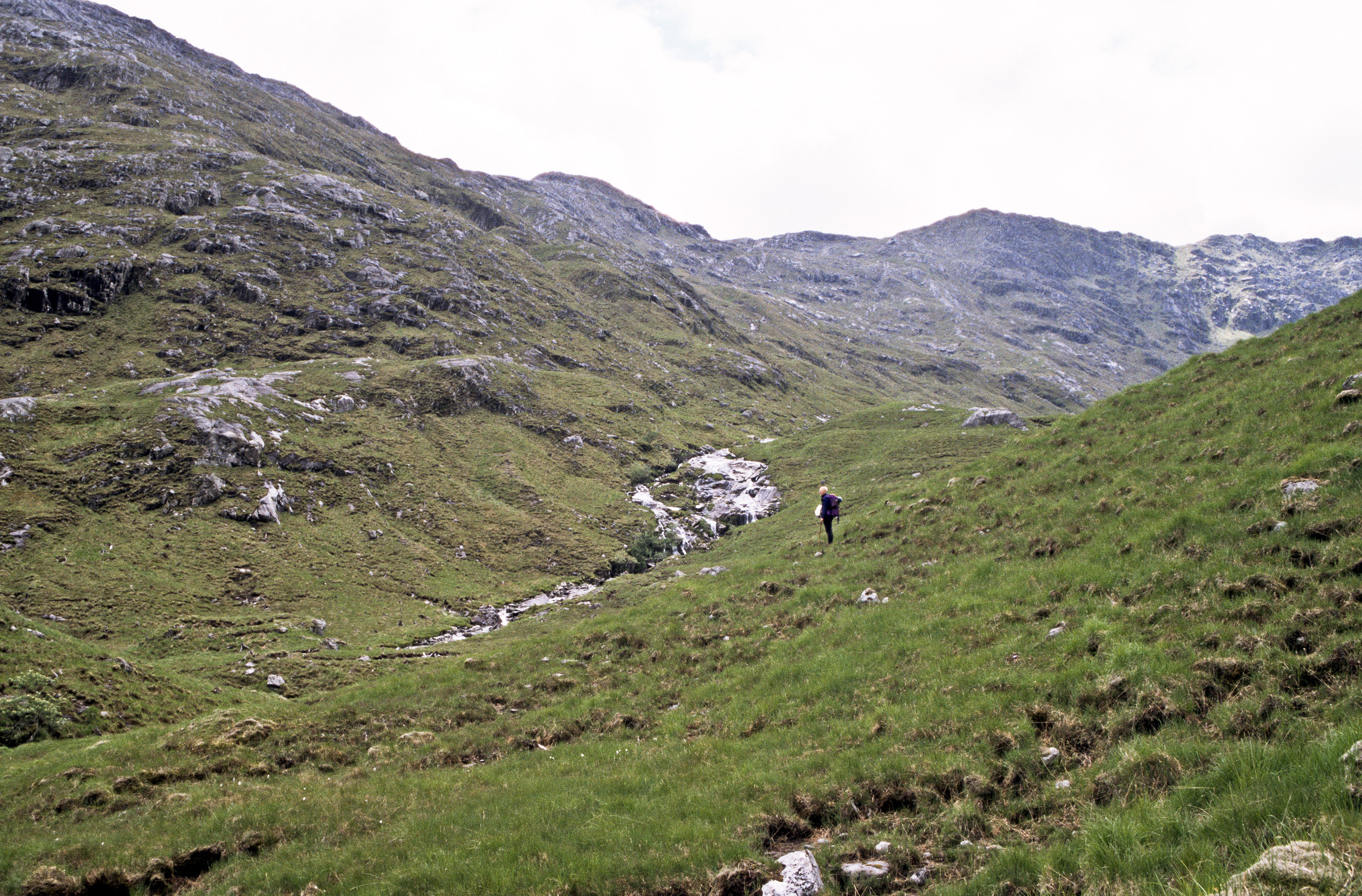 Overview of the nameless waterfall in the upper course of Abhainn Chòsaidh, with Mieke standing in front of it to give an impression of scale. No one ever comes here, a little further on there's plenty of room to set up our wee tent one day. In the distance to the right is Druim Chòsaidh's ridge.